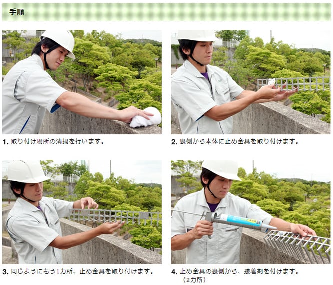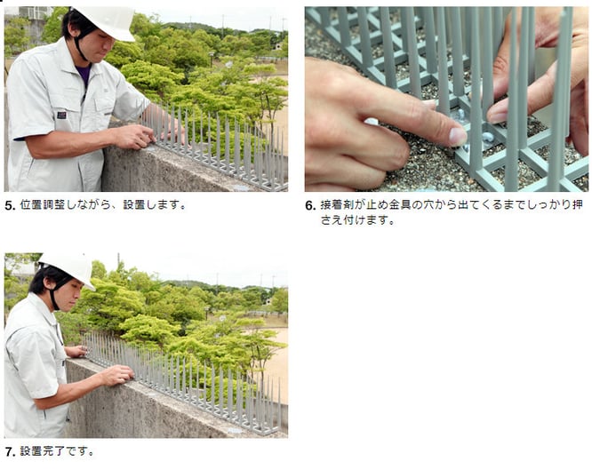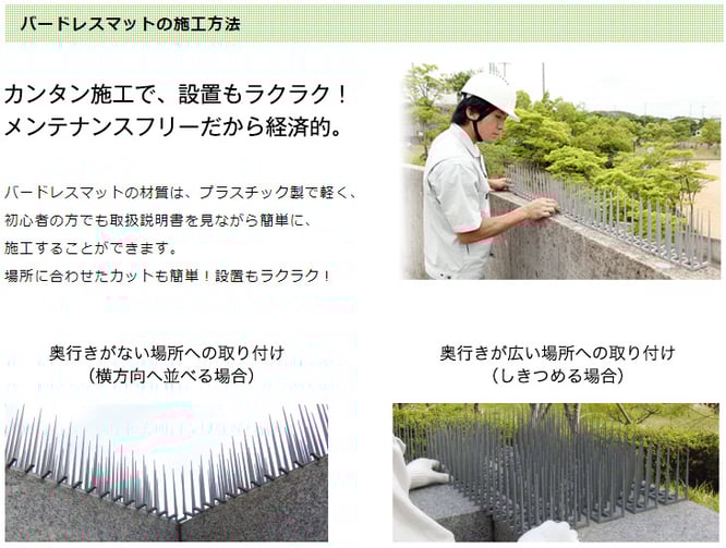 バードレスマットは用途に応じて切ったり、並べたりして、ハトやカラスの集まりそうな場所に設置するだけ。 迷惑なフン害を防止して、快適な暮らしを守ります。さらに、本製品はプラスチック製なので、接近した鳥を傷つける心配も無し。一度取り付けると、半永久的に使えます。先端が丸く柔らかで、簡単に加工・設置できます。