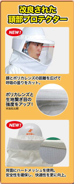 蜂の毒液や、殺虫剤が浸透しないつくりになっており、顔や頭部を 守ります。 周囲の視界が広く、作業性に優れているとともに、頭部の重量も軽量になっています。
